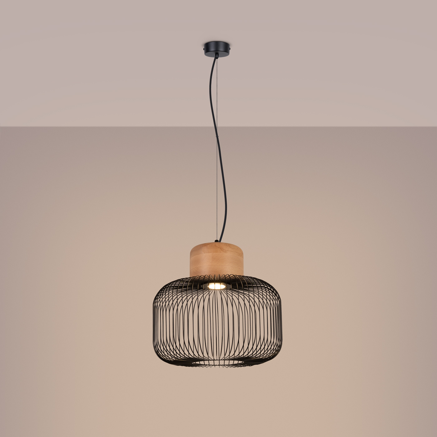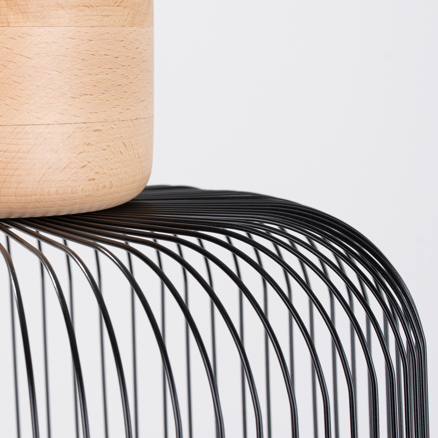 De GABBIA lamp is een unieke combinatie van natuurlijk hout met een lichte, maar toch stevige constructie gemaakt van staal. Het houten element aan de bovenkant voegt warmte en natuurlijkheid toe aan het geheel, terwijl de stalen, opengewerkte kap in de kleur zwart de lamp een moderne en licht industriële uitstraling geeft.
