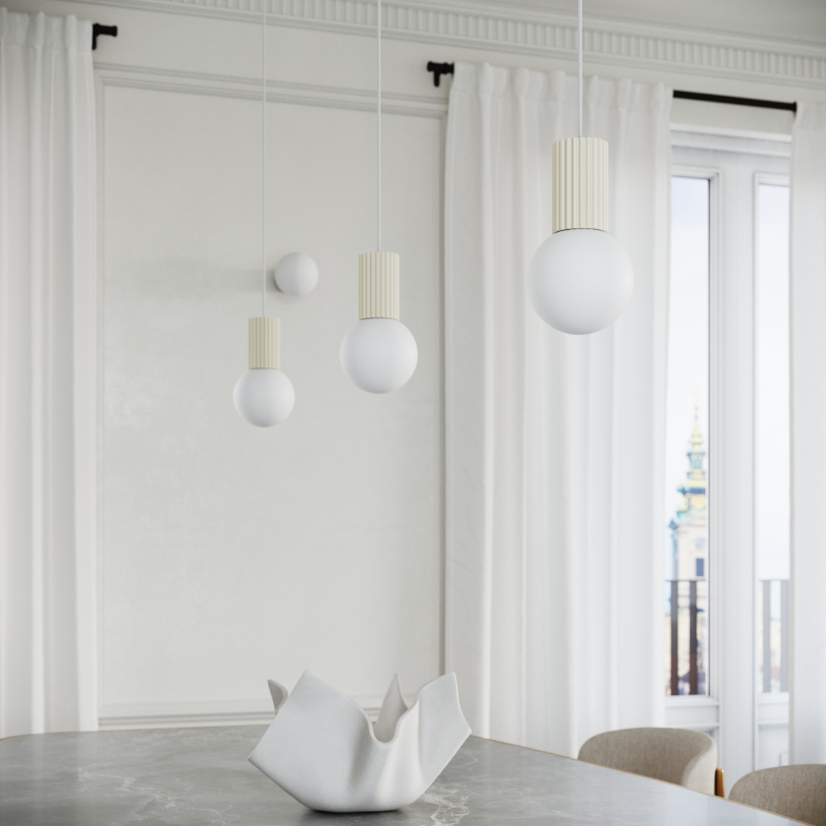 Ontdek HALO - een lamp die is ontworpen om het middelpunt van je interieur te worden. Hij trekt de aandacht met zijn kenmerkende vorm en geribbelde body, die in combinatie met een matte opalen bol een tijdloos duo vormen. HALO is verkrijgbaar als wandlamp, plafondlamp, enkele of driedubbele hanglamp en bureaulamp en biedt volledige vrijheid van opstelling en past naadloos in elke ruimte. Het kleurenpalet is een visueel feest: van klassiek zwart en wit tot olijfgroen en okerrood, en nu uitgebreid met gedurfde nieuwe tinten - bordeauxrood, taupe, choco, perzik en diep ultramarijn. HALO is meer dan alleen verlichting - het is een designstatement dat sfeer, persoonlijkheid en karakter in uw ruimte brengt.