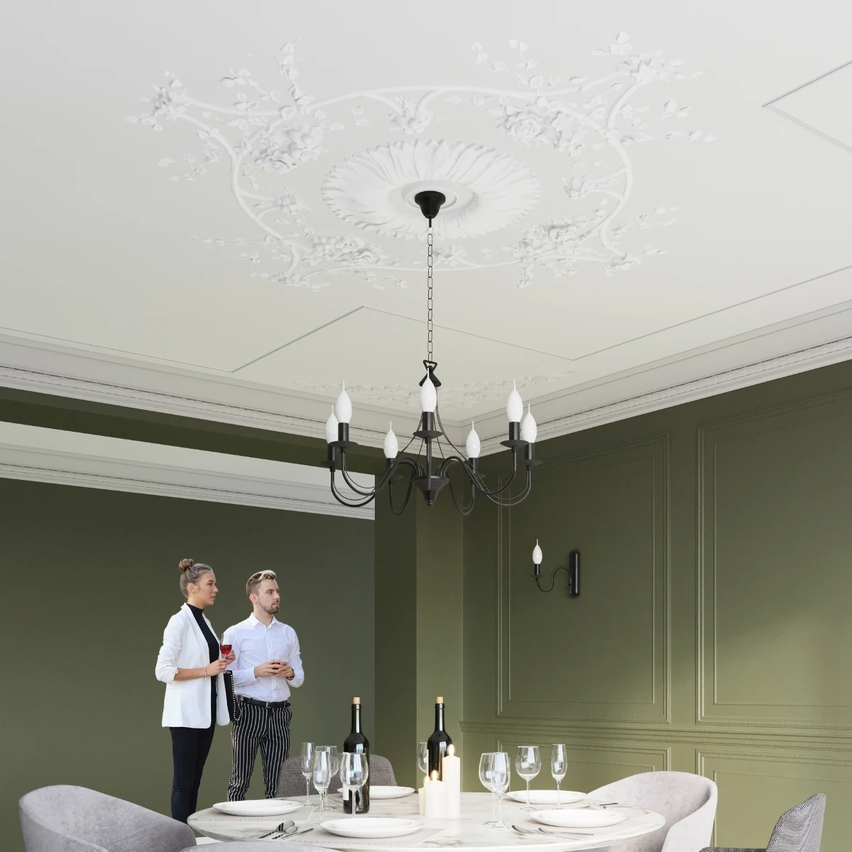 Zwart en wit zijn klassieke kleuren die in elk arrangement een plaats hebben. De uniforme kleur laat de rijke versieringen van de kandelaarkroonluchter goed tot zijn recht komen en zorgt voor de perfecte balans tussen vorm en inhoud.