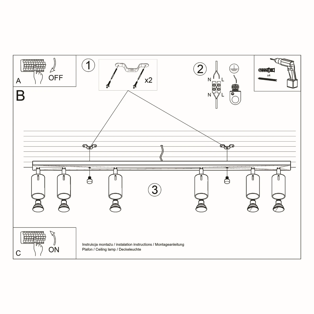 Verlicht je interieur met een plafondlamp voor 6 lampen, die je in elke ruimte kunt plaatsen. Verstelbare armen geven je een grote vrijheid bij het creëren van de sfeer van het interieur - van warme schemering tot vol licht, afhankelijk van de positie van de lampenkappen. De plafondlamp is ontworpen met gebruiksgemak in gedachten - kijk hoe hij voor uw comfort zorgt.